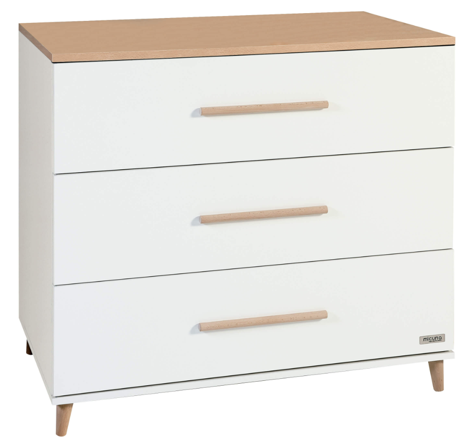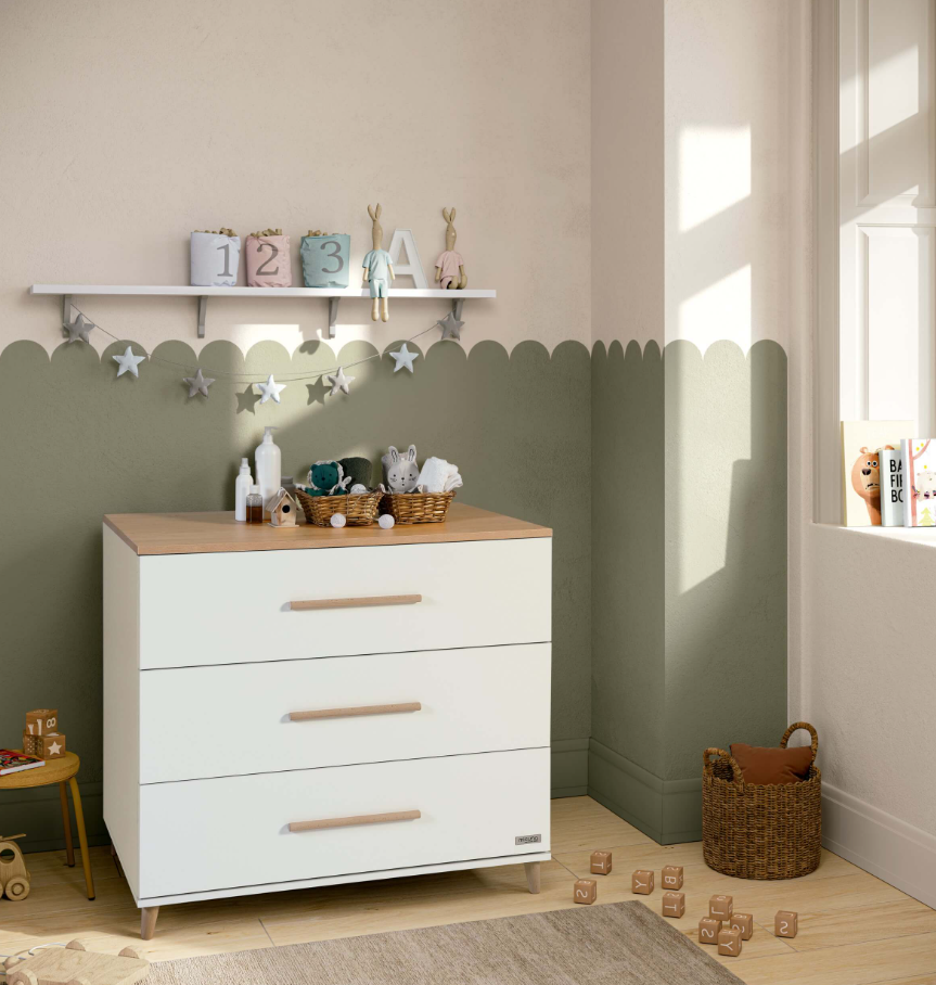 SOLO VENTA EN TIENDA La nueva cómoda CO-1972 se distingue por su nuevo diseño de tres cajones en color Blanco / Madera, permitiendo un gran almacenaje para todos los accesorios del bebé. Perfecta para cualquier estilo de decoración infantil. Completa la cómoda con el cambiador CP-1969 en blanco o madera Incluye patas. Color: Blanco-Madera