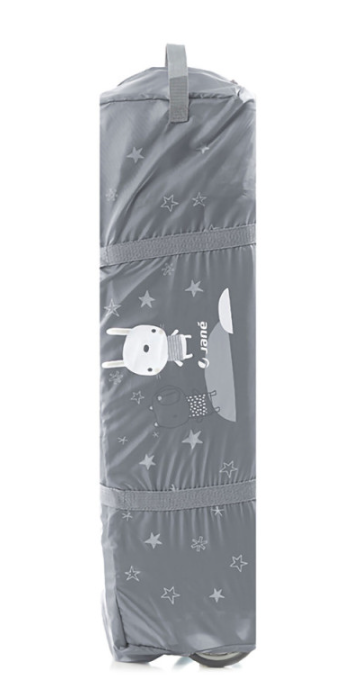 Práctica cuna de viaje One Level Toys de Jané apta desde el nacimiento, con arco de juguetes en la parte superior y una gatera que permite el acceso del bebé de forma sencilla. Incluye ruedas con freno para moverla con facilidad y una bolsa de transporte para que la pliegues y la guardes o lleves donde quieras cómodamente.